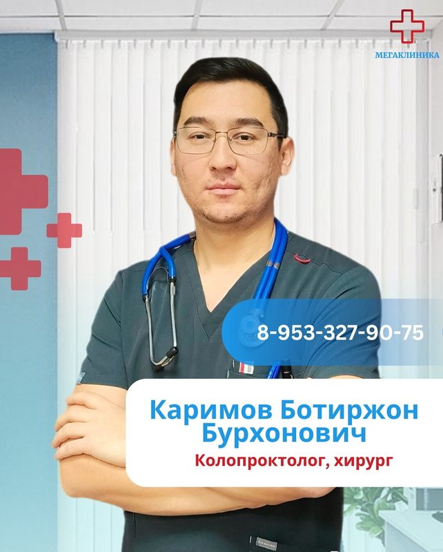 Каримов Ботиржон Бурхонович является врачом УЗИ, а также работает в сфере колопроктологии, флебологии и хирургии. Он ежедневно имеет дело в своей практике с болезнями анального канала, прямой кишки и ободочной кишки. Обращаться к колопроктолгам рекомендуется незамедлительно при появлении слизи в каловых массах, а также в случае возникновения новообразований (к примеру, гнойники, шишки, уплотнения и т.д.) в районе ануса.